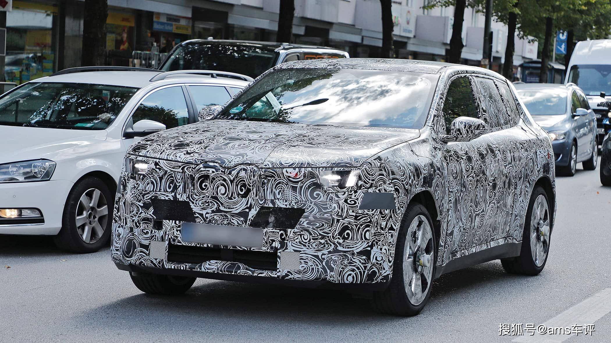 从伪装测试车照片来看,代号NB5的全新iX1延续了iX3的设计语言,但通过更紧凑的车身比例形成差异化。新车采用短前后悬设计,车身高度较现款降低,轮拱线条更为收敛。隐藏式门把手、窗框三角区外后视镜等细节均与iX3保持一致,车尾则通过向尾门内部延伸的灯组营造出宽体视觉效果。与iX3将牌照框置于后包围的设计不同,iX1选择将牌照框集成在尾门上,配合柔和的尾部线条,整体风格更显精致。车头部分,标志性的双肾格栅进一步收窄并向发动机舱盖延伸,两侧被纤细的LED灯组环绕,形成极具辨识度的前脸造型。